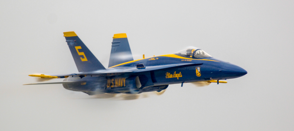 That afternoon, the skies were overcast, and I turned my attention to the headliner: the U.S. Navy Blue Angels. Cloud ceilings limited their routine to what they call a “low show,” with aerial demonstrations adapted for altitudes between 4,500 and 8,000 feet. Midway through the performance, the formation broke apart, transitioning into individual aerobatics. Then came the moment that always jolts the audience—a sudden, thundering flyby from Blue Angel #5, screaming low and fast down the runway, seemingly from out of nowhere.