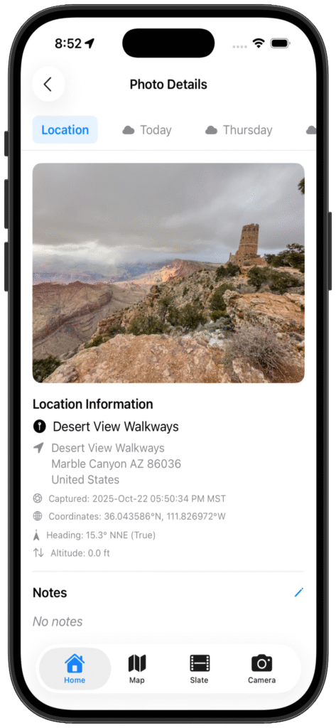• Smart Location Logging — Automatically record GPS, altitude, and heading with every photo.