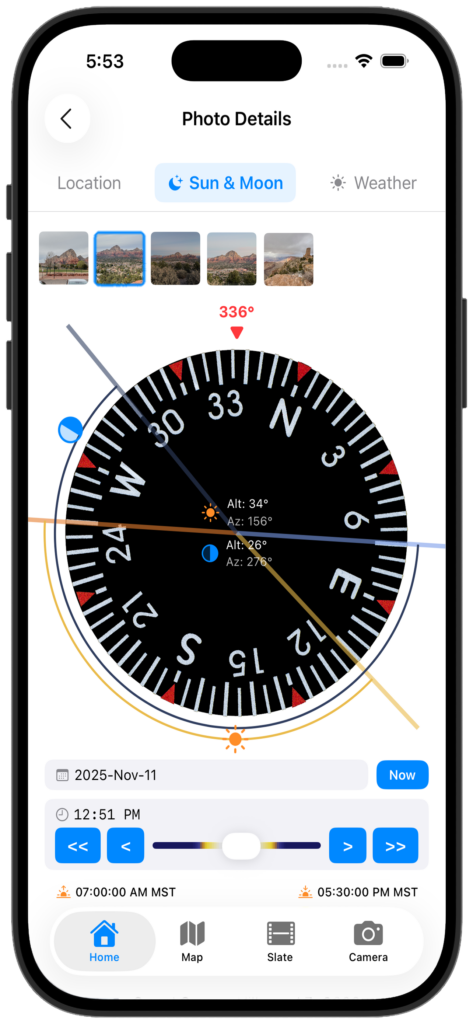 - Ephemeris & Sun/Moon Data โ Know exactly where the sun and moon will be at any saved location, at any time. Plan the shot before you’re there.