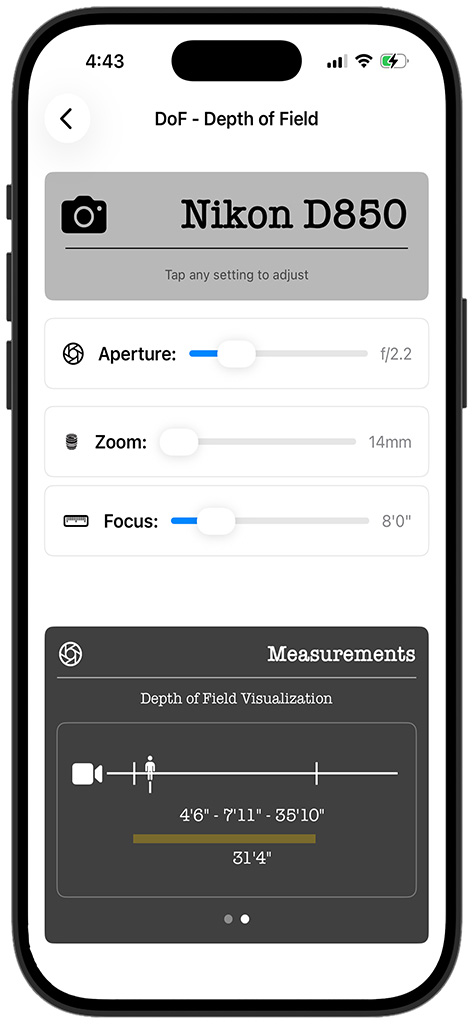 - Depth of Field โ Calculate and visualize DoF for your camera body and lens combination before you pull the trigger.