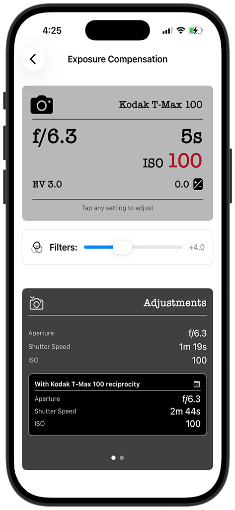 - Exposure Calculator โ Dial in aperture, shutter speed, and ISO โ including film reciprocity compensation for long exposures with your favorite stocks.