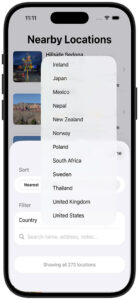 Tap Country to open a picker built from the locations already in your library — only countries you actually have locations in appear. If you’ve never added a location in Germany, Germany won’t be in the list. Add a location there and it appears automatically. Selecting a country narrows the entire list to locations within that country and unlocks the Region filter below it.