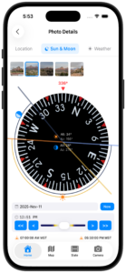 This helps you plan when to return to a location based on lighting direction.
